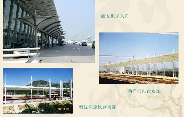 在我國隨著PTFE永久性膜材加工工藝的突破,也逐步為設(shè)計師們所應(yīng)用,如廣州白云機場候機大廳、西安機場入口、秦沈快速鐵路、葫蘆島站臺雨棚等等。此外,膜結(jié)構(gòu)在交通設(shè)施方面的應(yīng)用還包括加油站和公路收費站雨篷,大部分采用PVC涂層材料。建設(shè)火車站候車室及候機大廳一定要使用PTFE材料(永久性膜材),而建設(shè)公路收費站雨篷使用PVDF自潔性能較好的材料。