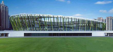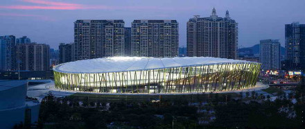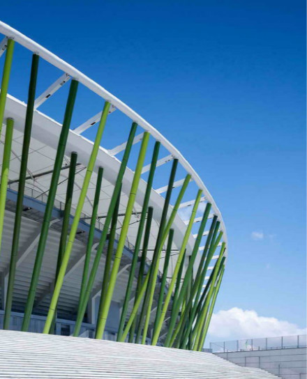深圳市寶安體育場是2011年大運會足球比賽場,由華南理工大學設(shè)計院和德國GMP公司合作設(shè)計。外圍護結(jié)構(gòu)設(shè)計了像竹竿一樣細密的184根綠色鋼柱,竹林般通透、輕巧;屋頂?shù)陌咨髂そY(jié)構(gòu),似白云飄在竹林上空。上部頂蓋罩棚采用全張拉膜結(jié)構(gòu),讓這座建筑呈現(xiàn)出“舉重若輕”的“素顏”美。