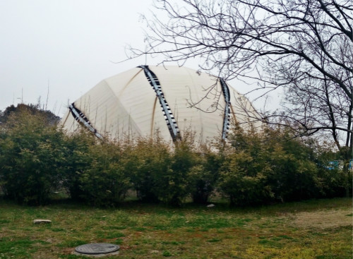 公園舞臺膜結(jié)構(gòu)屋頂,屋頂設(shè)計(jì)為半球形,鋼與膜的合理架構(gòu),實(shí)現(xiàn)了大跨度與牢固性的結(jié)合。