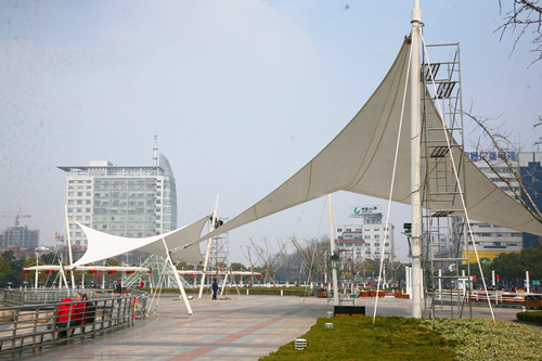 膜結(jié)構(gòu)標(biāo)志小品,結(jié)合江邊環(huán)境該小品設(shè)計(jì)為風(fēng)帆形狀,似即將遠(yuǎn)航的帆船,膜結(jié)構(gòu)設(shè)計(jì)的靈活性體現(xiàn)在此。
