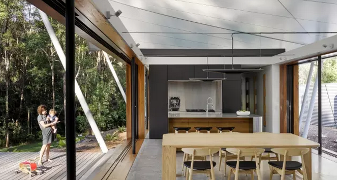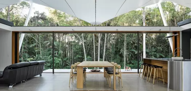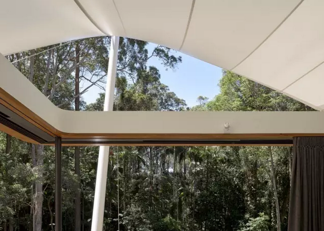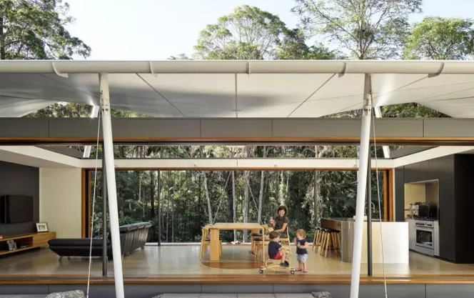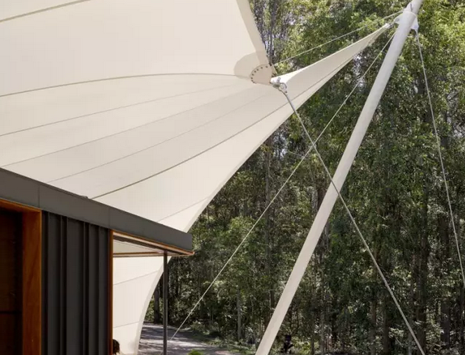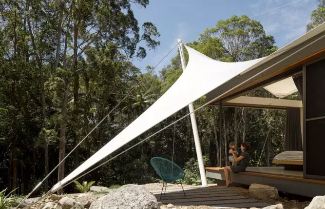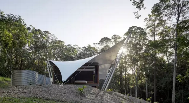 這樣小而精致的多元化帳篷房不僅能給人帶來舒適寫意的棲居方式,同時還可以最大化人與自然之間的互動。這中間張拉膜的運用是點睛之筆,隨意塑造的靈動造型,簡單的支撐構(gòu)件,視覺上的美感不言而喻。該帳篷房位于澳大利亞Eumundi, Queensland,建筑面積約344平方米。