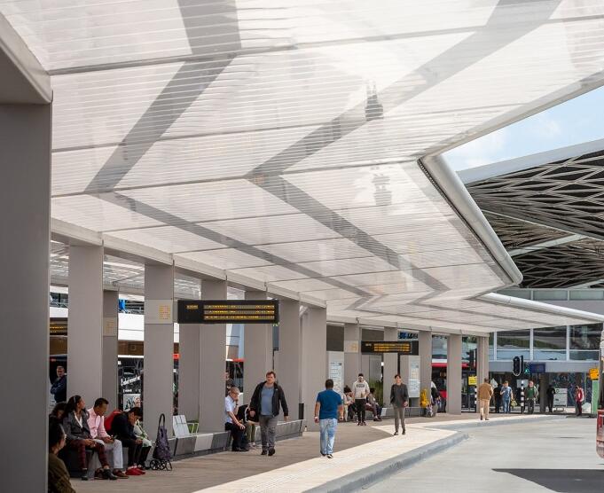 車站由一系列非常薄的柱子組成,頂部是一個簡約的遮陽蓬結(jié)構(gòu),形成了中心開放,長度超過160米的三角形流線。汽車??奎c(diǎn)沿著外側(cè)布置,共有6個上車點(diǎn)1個下車點(diǎn)。遮陽篷結(jié)構(gòu)總體寬度為14到30米,結(jié)構(gòu)功能齊全與城市環(huán)境相協(xié)調(diào),寬闊的遮陽蓬結(jié)構(gòu)完全覆蓋了整個公共汽車站臺和??科嚨囊徊糠郑虼寺每涂梢酝耆谡陉柋苡甑那闆r下上下車。