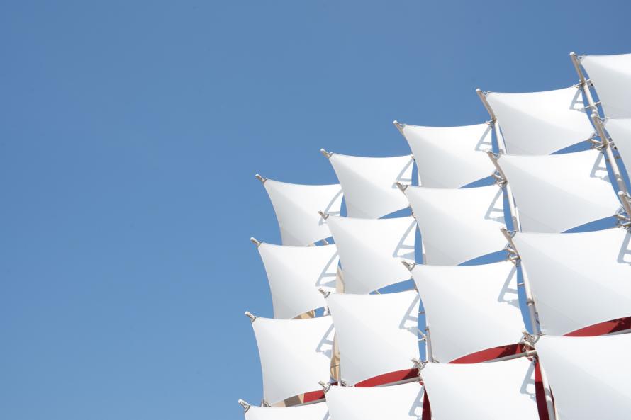 在二期項(xiàng)目中,通過(guò)用膜結(jié)構(gòu)覆蓋現(xiàn)有建筑形成的不規(guī)則體量結(jié)構(gòu)的三面,簡(jiǎn)化其在公園內(nèi)的形象。同時(shí),通過(guò)采用參數(shù)化設(shè)計(jì)和引入自然紋理的動(dòng)感,膜結(jié)構(gòu)的設(shè)計(jì)被賦予了同質(zhì)化的動(dòng)態(tài)形象,提供一個(gè)同質(zhì)的動(dòng)態(tài)圖像。