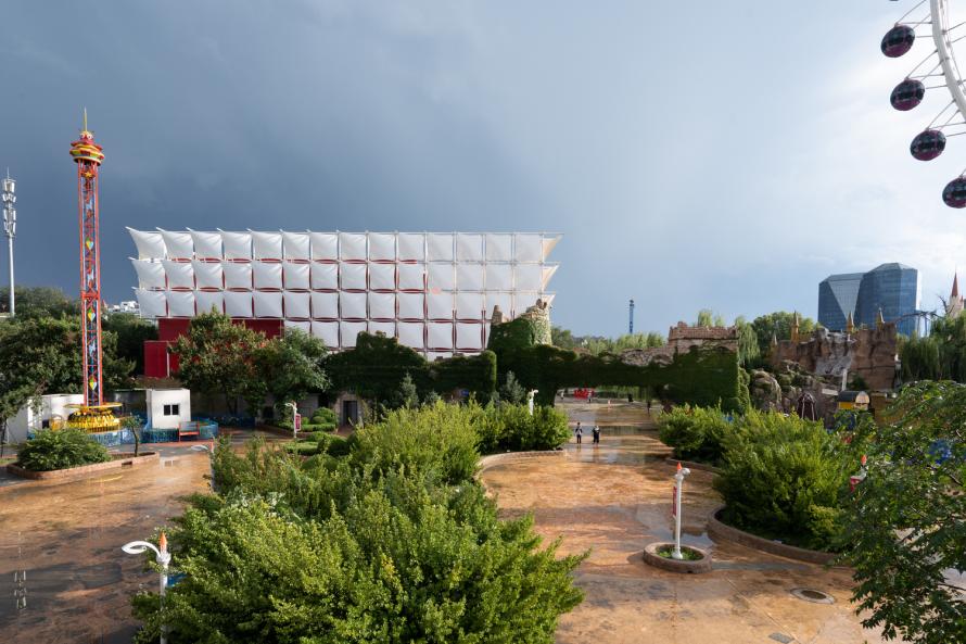 在一期項(xiàng)目和二期項(xiàng)目中,建筑都采用了項(xiàng)目的主題色--紅色,先建造一個(gè)滿足建筑基本功能的體量,再通過(guò)在體量上疊加一個(gè)由膜材料構(gòu)成的靈活形式,創(chuàng)造出一個(gè)動(dòng)態(tài)形象,這樣處理,不但縮短了施工周期,還大大降低了項(xiàng)目成本。