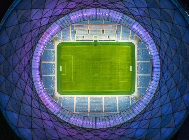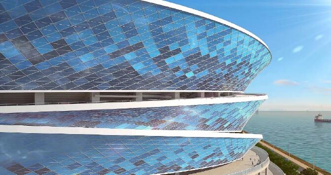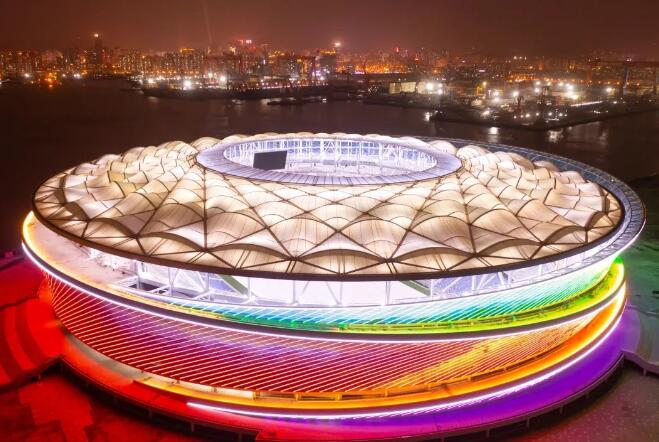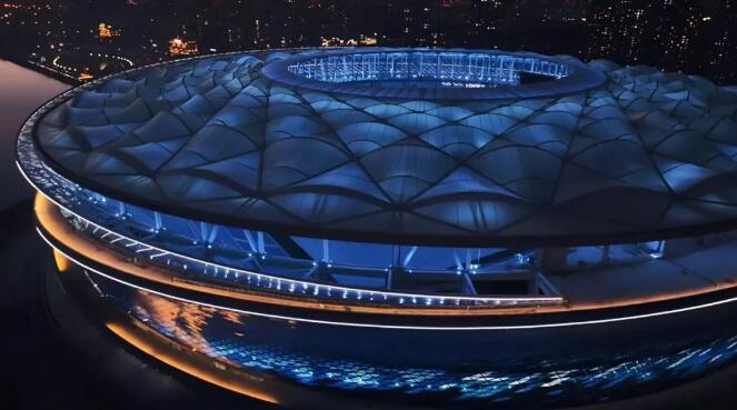項(xiàng)目屋面由約4萬平方米PTFE膜打造成波浪造型,外立面由ETFE索膜結(jié)構(gòu),與環(huán)繞索膜泛光照明體系組成。其中,外立面使用的ETFE膜包含9種藍(lán)色膜材、7823片膜片,是目前世界上專業(yè)足球場(chǎng)膜結(jié)構(gòu)覆蓋面積最大,采用單層ETFE膜結(jié)構(gòu)最多的工程。