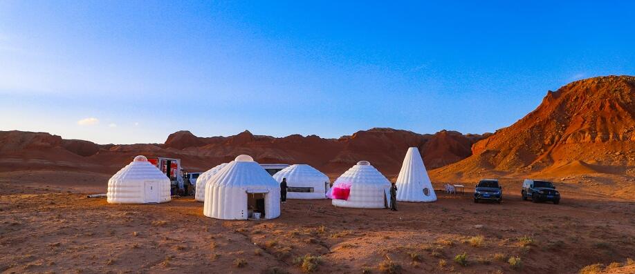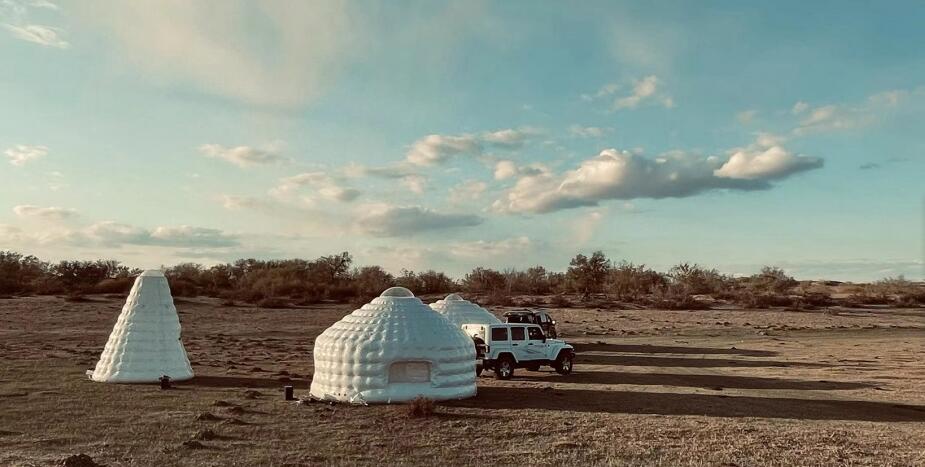 充氣蒙古包宜做直徑3-10米,也可定做更大規(guī)格。對于4米充氣蒙古包來說,重量可達到45kg。10分鐘快速充氣搭建完成,15分鐘泄氣收納折疊完成。收納折疊后體積從34.34m³變成0.8m³,可放入車的后備箱,車載式的充氣蒙古包改變了傳統(tǒng)蒙古包的運輸方式。雙層PVC氣囊墻使充氣蒙古包有較好的保溫性和隔熱性,同時具備了防潮防水的特性。材料的透光特質,使得充氣蒙古包夜晚的發(fā)光方式特別,讓草原上的人更容易找到方向和目的地。