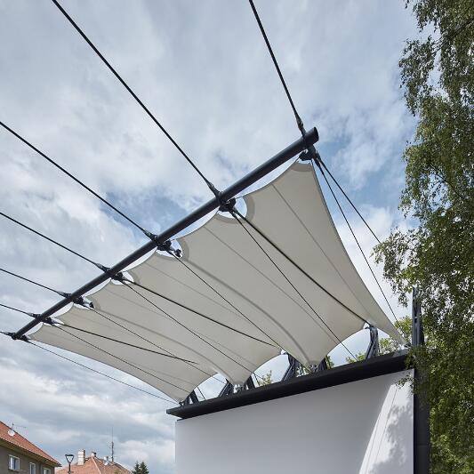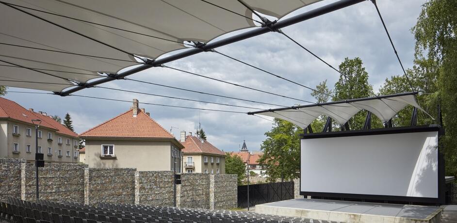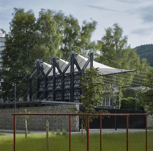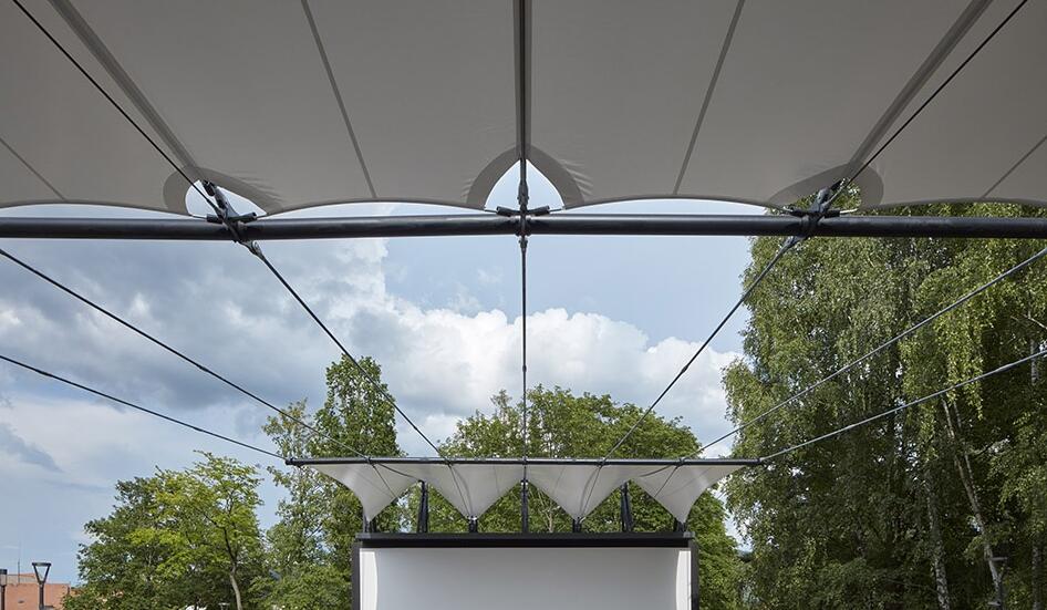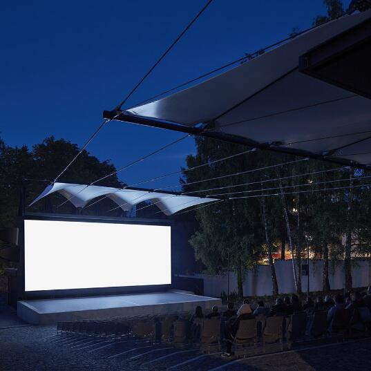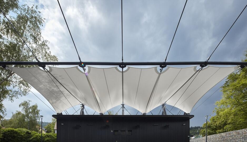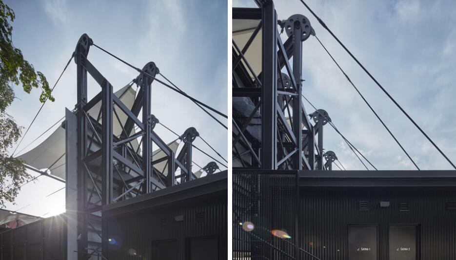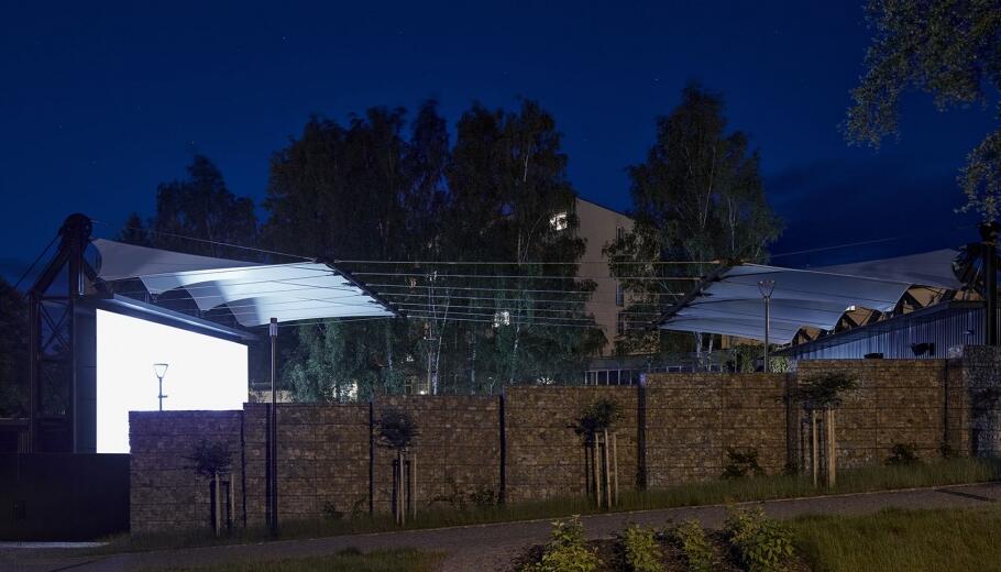無論是晴朗的午后還是雨夜,舞臺(tái)和觀眾席上方的織物膜材屋頂不僅能提高演員和觀眾的舒適度,還能提升影院劇場(chǎng)的聲學(xué)特性。采用張拉膜結(jié)構(gòu)屋頂解決方案的目的是最大限度地減輕建筑的重量,考慮到建筑的高自由度,增加了額外的支撐元素。繩索的鋼結(jié)構(gòu)支撐不僅是功能和技術(shù)元素,也是美學(xué)元素。
