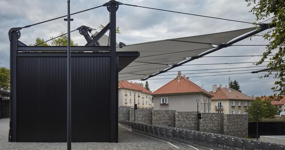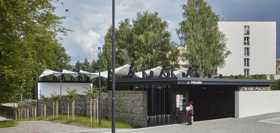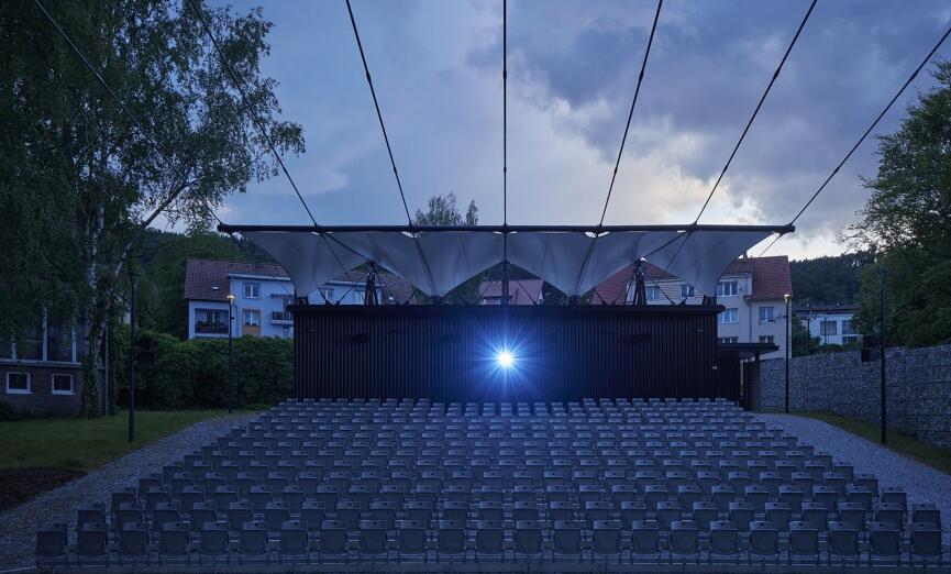 捷克.普拉哈季采,這是一座荒廢露天電影院的改造案例,設(shè)計(jì)理念來自于多季節(jié)使用的需求及電影膠卷的靈感。依據(jù)電影放映機(jī)中的膠片卷軸系統(tǒng),結(jié)構(gòu)的設(shè)計(jì)轉(zhuǎn)化為控制屋頂?shù)睦?。屋頂?shù)姆浪げ?,精巧的鋼結(jié)構(gòu)和波紋鋼板創(chuàng)造了光的錯(cuò)覺。