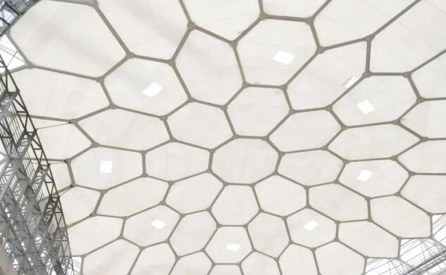 PTFE膜材料所采用的玻璃纖維是目前世界上最細的品種,具有良好的抗折疊和抗彎曲性能,PTFE膜材的生產(chǎn)、加工和安裝給予了膜結(jié)構(gòu)屋面建筑最大的安全保障。