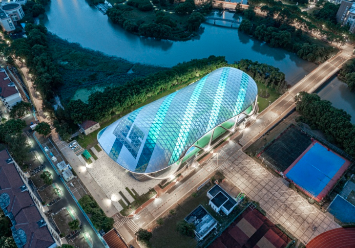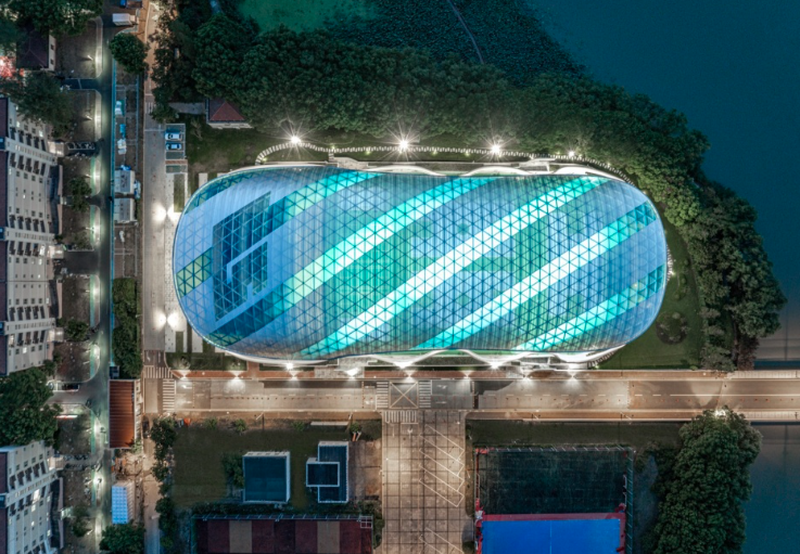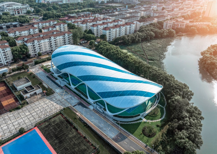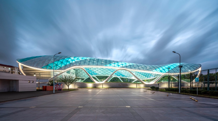 弧形屋面由單層 ETFE張拉膜包裹金屬骨架形成,骨架由簡(jiǎn)潔的三角元素拼合而成。從內(nèi)部看,富有節(jié)奏和律動(dòng)的變化,產(chǎn)生了韻律之美。在膜材的選擇過程中,特意選取藍(lán)、白兩種顏色以及不同透明度的膜材,按照金屬鋼骨架的結(jié)構(gòu)走向進(jìn)行間隔搭配布置,呈現(xiàn)出跳躍般的變化?;⌒蔚谋砻娣瓷涑鲋車h(huán)境,模糊了屋頂與天空的界線。建筑兩個(gè)長(zhǎng)邊采用了波浪狀的飄帶鋼柱展現(xiàn)出柔中有剛的力量感,實(shí)現(xiàn)了結(jié)構(gòu)成就建筑之美的理念。
