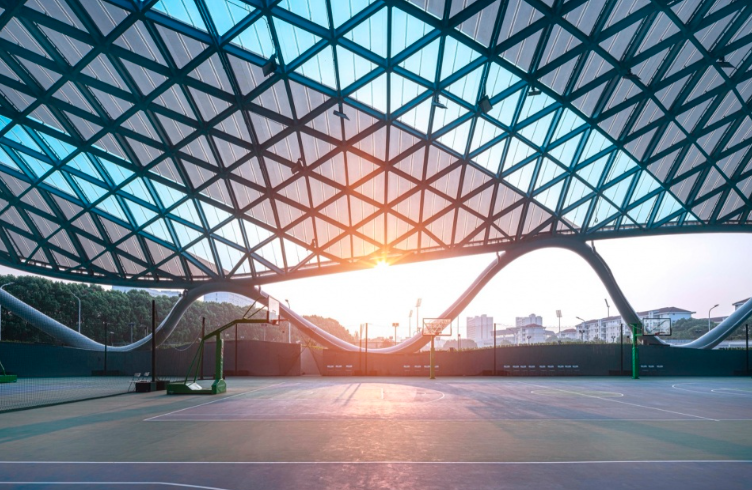 風(fēng)雨操場(chǎng)屋面隨形體起伏,建筑高度呈彈性變化,與運(yùn)動(dòng)場(chǎng)地有機(jī)融合,最終呈現(xiàn)的弧形屋頂營(yíng)造出豐富絢麗的第五立面效果。半圍合的結(jié)構(gòu)形式為風(fēng)雨操場(chǎng)賦予了更為人性化的開闊尺度。通透靈動(dòng)的形態(tài)不僅有利于通風(fēng)和采光,還使外立面形體獲得更多自由,并降低了建設(shè)成本。
