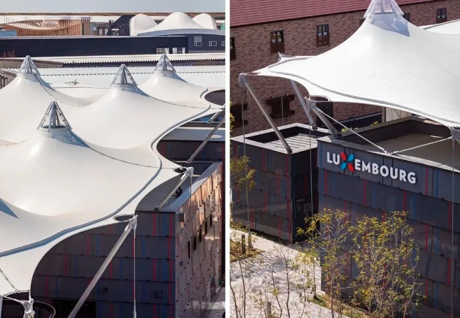 建筑由三個(gè)特色元素組成,與2025年世博會(huì)的三個(gè)主題相對(duì)應(yīng):“設(shè)計(jì)未來(lái)社會(huì)”,這是博覽會(huì)的總主題,代表著人們共同擁有的獨(dú)一無(wú)二的東西,人們共享同一個(gè)地球,該理念由覆蓋展館的一整個(gè)膜結(jié)構(gòu)大屋頂代表,代表這是盧森堡國(guó)家的項(xiàng)目,它的輻射力和傳播力可以超越國(guó)界。
