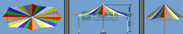 觀瀾一體育公園景觀膜結(jié)構(gòu)出入口工程,下圖為公司出的方案設(shè)計效果圖,出入口設(shè)計為曲線邊界橢圓形,整體似一把彩虹色的大傘,集時尚、活潑、功用于一體。