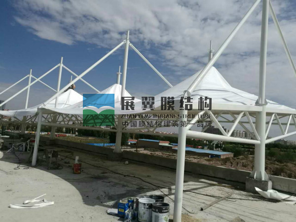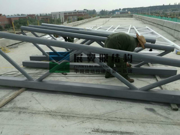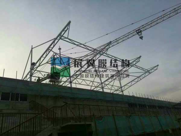 寧夏中寧第六中學膜結構主席臺工程近日正在施工,工程現(xiàn)已完成材料加工、油漆、焊接、吊裝、膜材覆蓋等工作,接下來進行結構附件緊固及膜材拉伸除皺工作,以下為現(xiàn)場施工圖片: