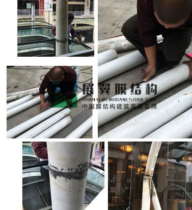 江西贛州萬盛廣場電梯膜結構雨棚工程近日正在施工,鋼結構加工完畢后進入安裝工序,之后將是膜材的覆蓋工作,下面是現(xiàn)場施工圖: