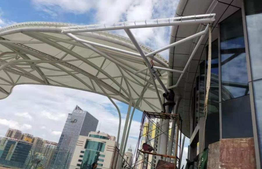 佛山雄盛王府屋頂泳池膜結(jié)構(gòu)頂棚工程近日基本完工,工程采用PTFE膜材,目前工人正進行最后完善工作。
