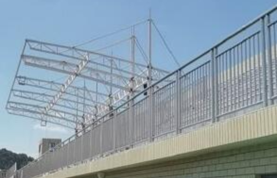 廣州天河區(qū)職業(yè)技術(shù)學(xué)院膜結(jié)構(gòu)體育看臺工程已完成鋼結(jié)構(gòu)安裝工序,接下來進行膜材覆蓋工作,整個看臺懸挑12米,膜覆蓋面積近500平方米。