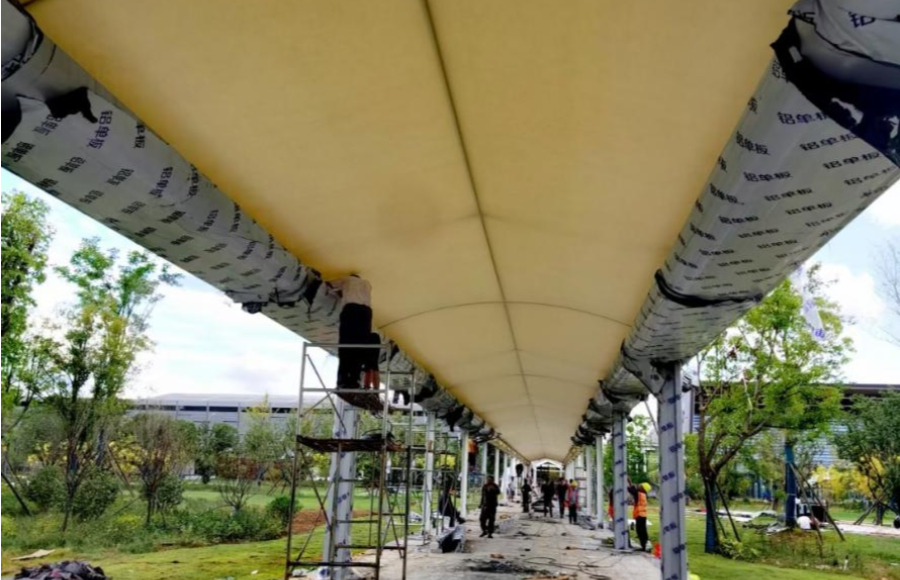 長(zhǎng)沙國(guó)際會(huì)展中心景觀膜結(jié)構(gòu)長(zhǎng)廊項(xiàng)目已接近工期尾聲,工程現(xiàn)場(chǎng)如下: