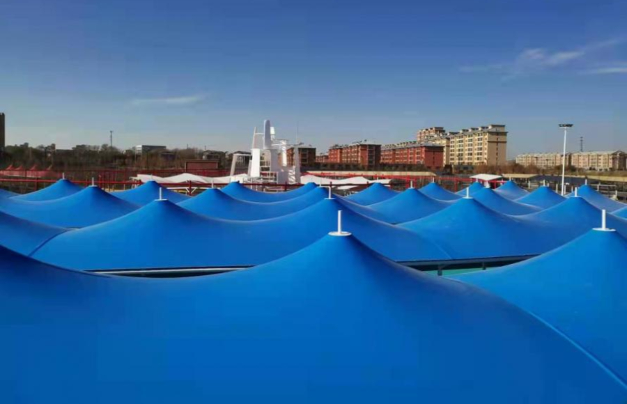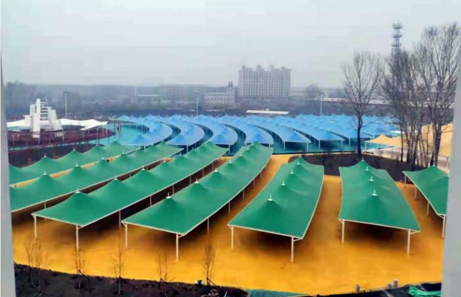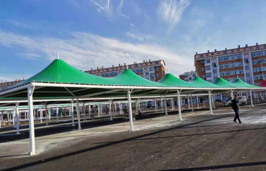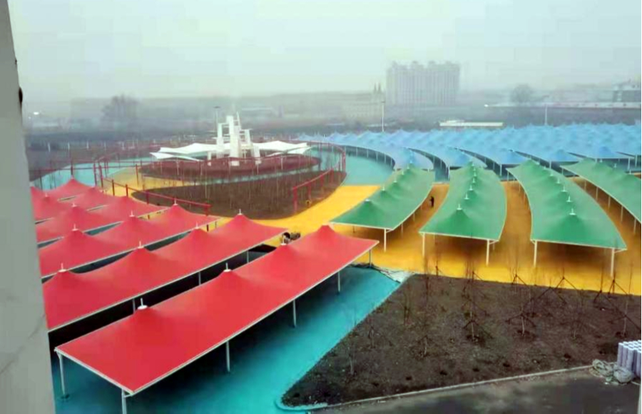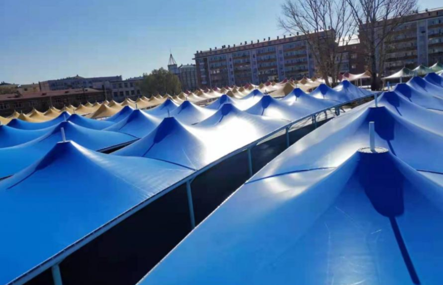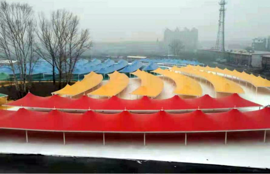 黑龍江鐵力經(jīng)開區(qū)集市大棚膜結構工程近日完工,大棚設計為尖頂張拉結構,采用白、紅、黃、藍、綠五色膜材,一排排一列列遍布于廣場之上,顯得十分壯觀。