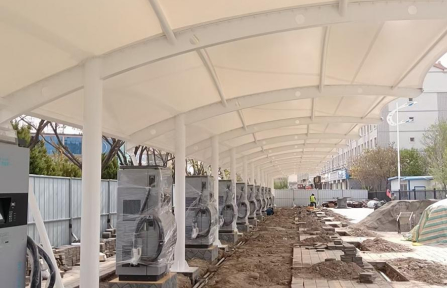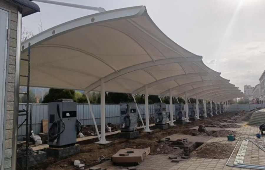 甘肅酒泉充電樁張拉膜結(jié)構(gòu)工程近日基本完工,車棚設(shè)計為氣單邊懸挑結(jié)構(gòu),造型優(yōu)美。