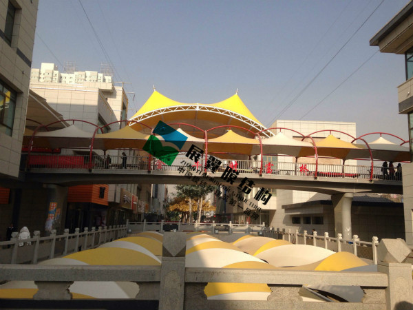 蘭州金牛街膜結構工程全系列包括膜結構天井、膜結構屋頂遮陽棚、膜結構天橋通道遮陽棚、啤酒屋膜結構屋頂、特殊膜材玻璃房等等、工程全部采用彩色膜材搭配建造,造型設計別出心裁。這些張拉膜建筑不但具備強大的實用功能,同時也成為了商業(yè)街一大觀賞亮點。