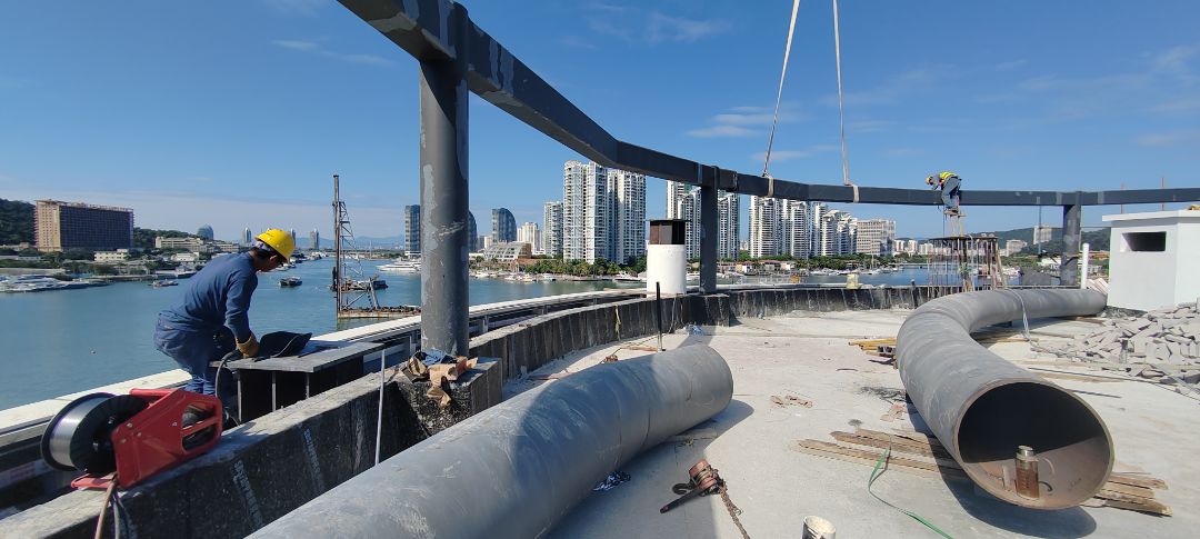 三亞南邊海國際游艇薈膜結構屋頂工程近日正在緊張有序地施工,材料均已進場并進行安裝。該工程采用鋼骨架馬鞍形張拉膜結構型式,上覆ETFE膜材,工程面積約1100平方。