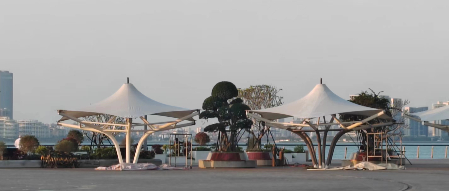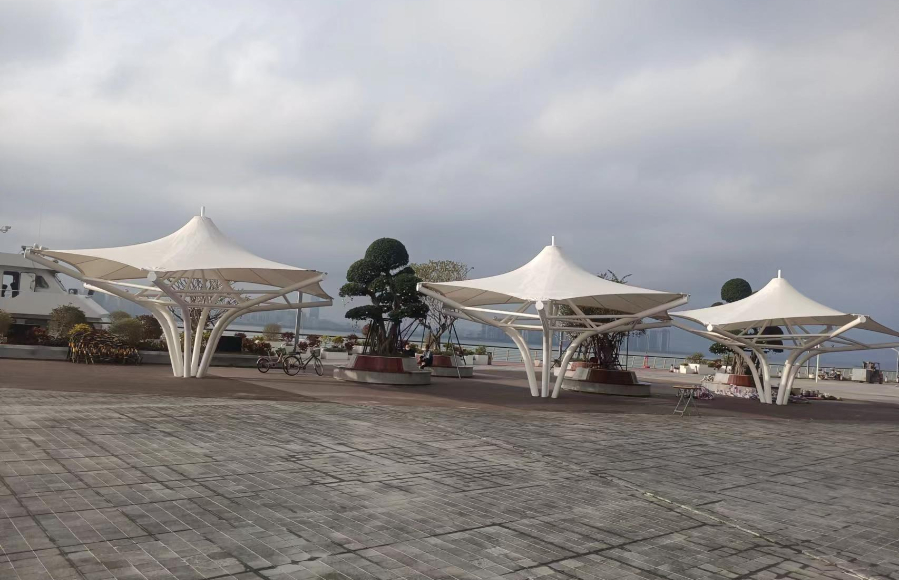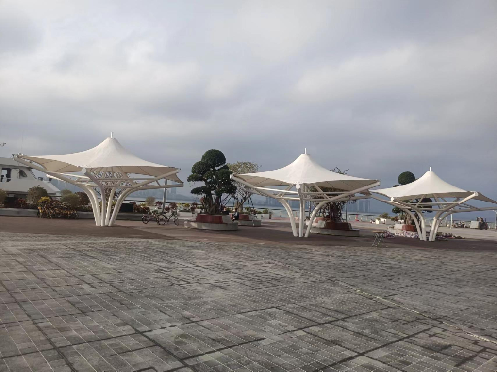 ??跒硰V場(chǎng)景觀張拉膜結(jié)構(gòu)工程近日基本完工,膜材已覆蓋完畢,三組體量的涼亭立于海邊廣場(chǎng),既是遮陽(yáng)避雨設(shè)施,又是與環(huán)境契合完美的景觀裝置。