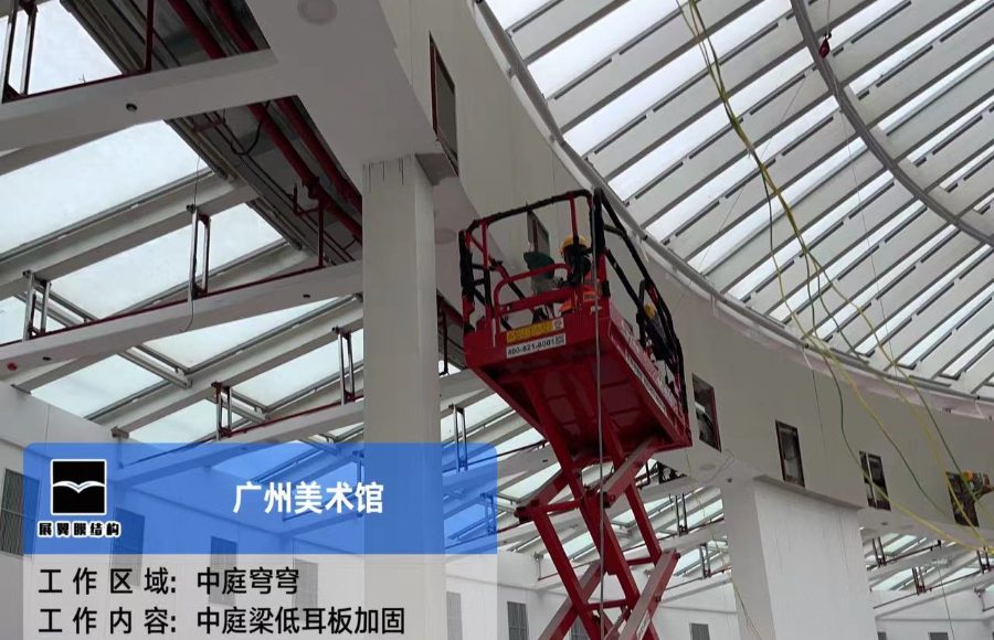 廣州美術館中庭屋面膜結構工程近期開始施工,工程采用鋼索張拉連結形成網狀主結構,網格間覆膜的張拉支撐體系架構。工程安裝面積約1000㎡。