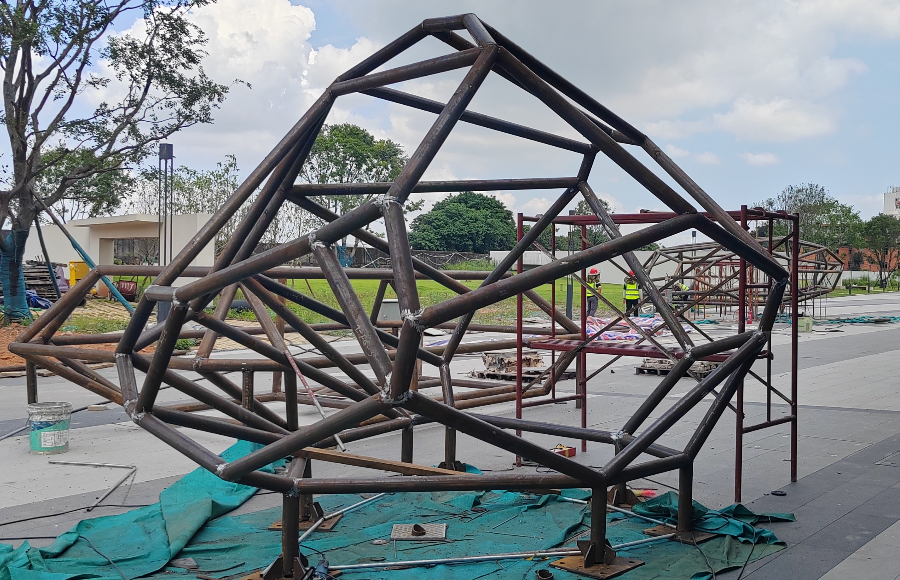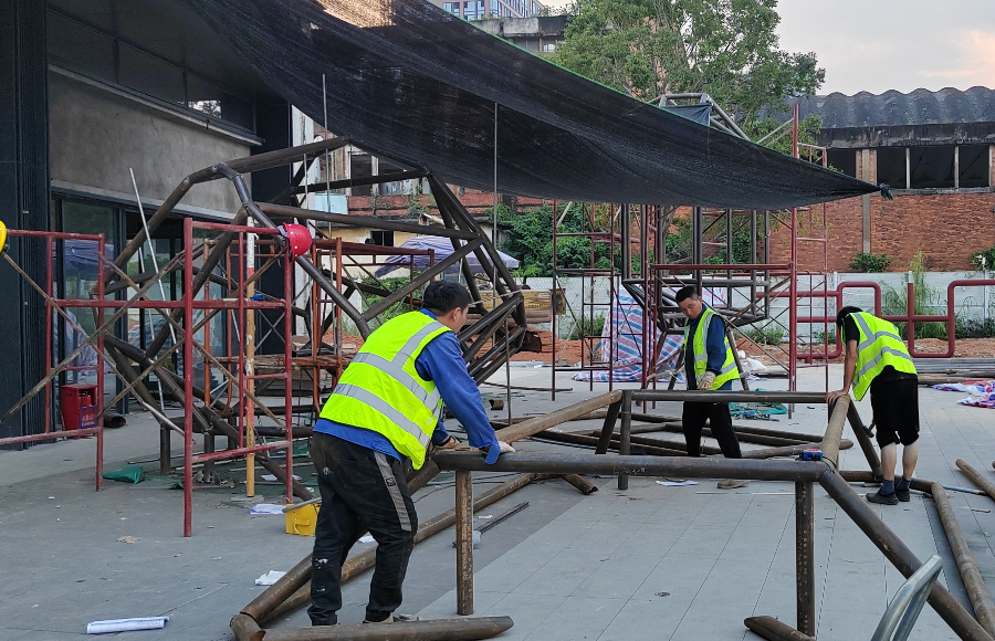 粵海江門甘化廠濱江綠化帶景觀膜結(jié)構(gòu)工程正在施工當(dāng)中,目前進(jìn)行鋼結(jié)構(gòu)的拼裝工序。