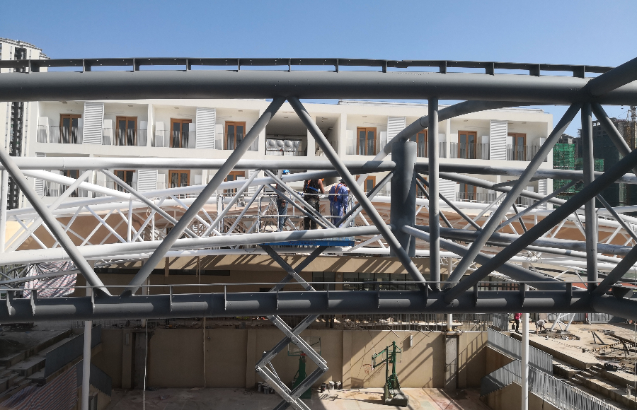 四川德陽青衣江路學(xué)校風(fēng)雨操場膜結(jié)構(gòu)項目已完成鋼結(jié)構(gòu)安裝,目前正進(jìn)行膜材覆蓋工作。