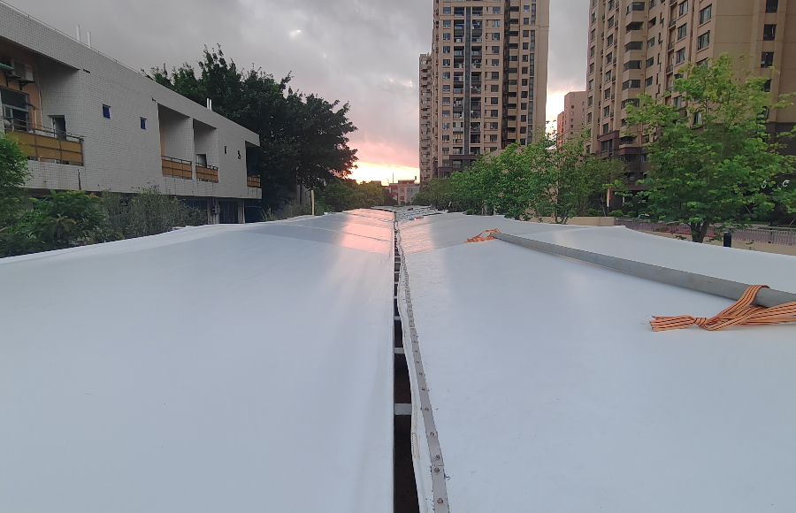 中山美荔新天地膜結(jié)構(gòu)停車棚工程正在施工,車棚設(shè)計為雙邊懸挑造型,目前工程進(jìn)行膜材的覆蓋工作,不日將完工。