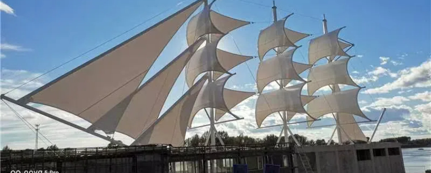 黑龍江省鐵力市景觀膜結(jié)構(gòu)工程“風(fēng)帆”已接近完工,工程以“風(fēng)帆”為靈感設(shè)計了一組景觀裝置,豎起的鋼管桅桿,膜材張拉出風(fēng)帆形狀,似一艘巨輪揚帆啟航。