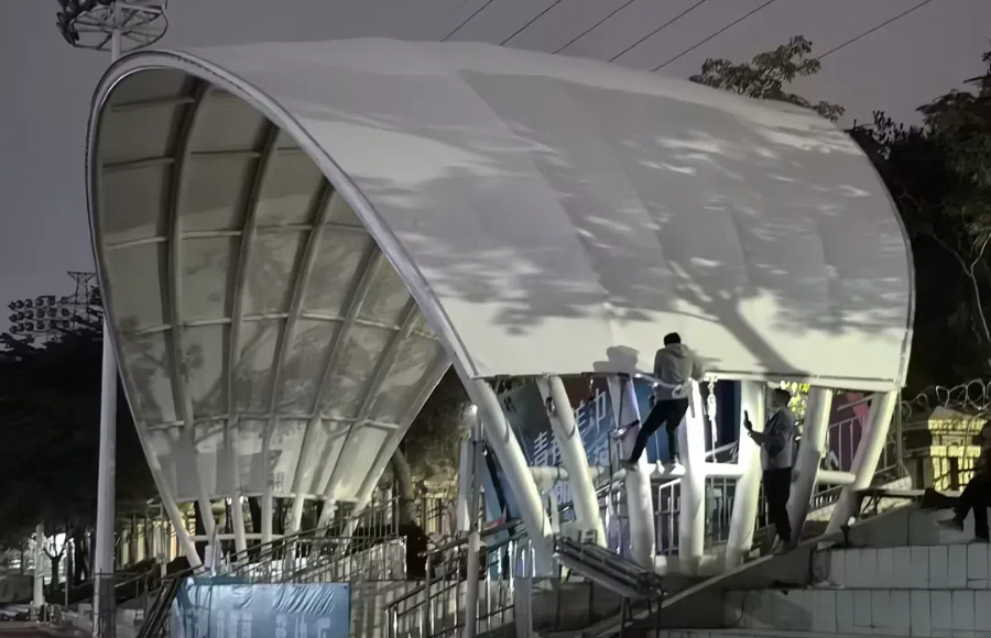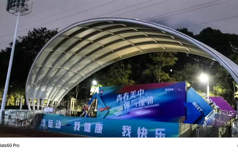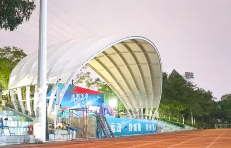 深圳美中學(xué)校主席臺(tái)張拉膜結(jié)構(gòu)工程完工,主席臺(tái)設(shè)計(jì)為拱形,鋼骨架作為支撐結(jié)構(gòu),覆蓋白色膜材,在燈光的搭配下更加美觀(guān)。