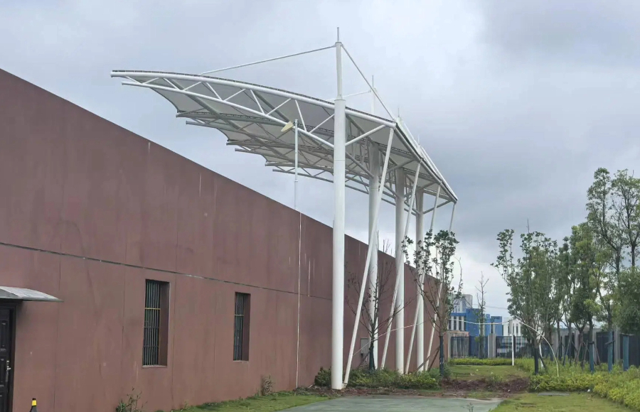 長(zhǎng)沙翰林府明德智谷學(xué)校膜結(jié)構(gòu)看臺(tái)工程近日基本完工,看臺(tái)設(shè)計(jì)為懸挑張拉結(jié)構(gòu)。