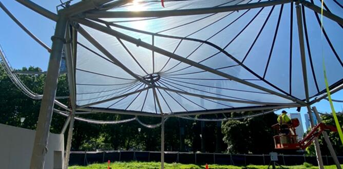 ETFE 膜材的注意事項:由于ETFE膜材強度低,需增加拉索以減小膜面跨度。拉索要穿過在膜面加焊的索套膜,以便與膜材協(xié)同工作。采用雙向索網(wǎng)或加設(shè)鋼梁時,還需要在索交叉點設(shè)置索夾。索套膜、交叉索夾、拉索及索頭都會影響膜面張拉和外觀效果。