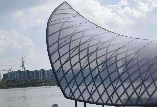 STFE 膜材的優(yōu)點:覆膜的清晰度較好,可實現(xiàn)一定程度的透景。同時,由于有織物基材提高了膜材強度,抗拉強度可達(dá)4000N/5cm。即使不加拉索,膜單元跨度一般在3m以上。