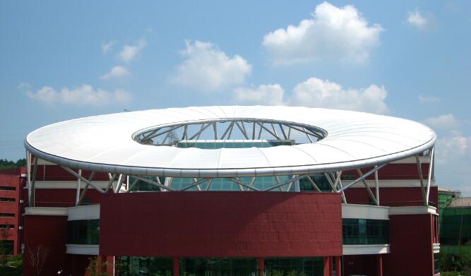 PTFE 網(wǎng)格覆膜的優(yōu)點:玻璃纖維紗線編織工藝成熟,可定制高強度的織物基材,能夠達(dá)到G6等級。即使不加拉索,膜單元跨度一般可達(dá)5m左右。初始預(yù)張力高,張拉平整、外觀效果好,PTFE的耐久性、自潔性好。