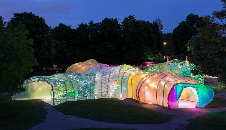 在非體育建筑上,ETFE也被廣泛應(yīng)用,最受關(guān)注的當(dāng)屬SelgasCano設(shè)計(jì)的2015蛇形畫廊,建筑師用了19種不同顏色的薄膜包裹了一個(gè)極簡(jiǎn)的鐵質(zhì)框架,來呈現(xiàn)一種萬花筒的效果。另一個(gè)例子是KieranTimberlakeArchitects設(shè)計(jì)的倫敦美國大使館,ETFE的鰭狀凸起有助于建筑東西南三面的遮陽,同時(shí)增加進(jìn)光量并防止鳥類誤撞。