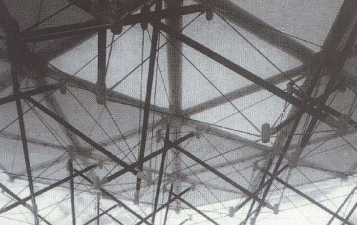 20世紀(jì)50年代,美國(guó)建筑大師富勒受自然現(xiàn)象啟發(fā),構(gòu)筑了富勒球結(jié)構(gòu),他將這種結(jié)構(gòu)解釋為“壓的孤島存在于拉的海洋之中”,即由不連續(xù)的系列壓桿與連續(xù)的系列拉索構(gòu)成整體空間球結(jié)構(gòu)。美國(guó)著名結(jié)構(gòu)專家蓋格認(rèn)為富勒球?qū)儆趶埩Y(jié)構(gòu)體系,體系中的拉索若無(wú)松弛則為失穩(wěn)之慮,蓋格依此提出了索膜穹頂空間結(jié)構(gòu)體系。索膜穹頂結(jié)構(gòu)一經(jīng)出現(xiàn),立即為國(guó)際空間結(jié)構(gòu)工程所矚目。