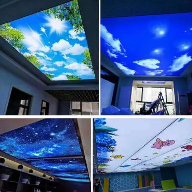 通常我們所見的軟膜天花有2種,一種是透光軟膜天花,呈乳白色。另外一種是UV軟膜天花,色彩絢麗,可定制任何圖案。