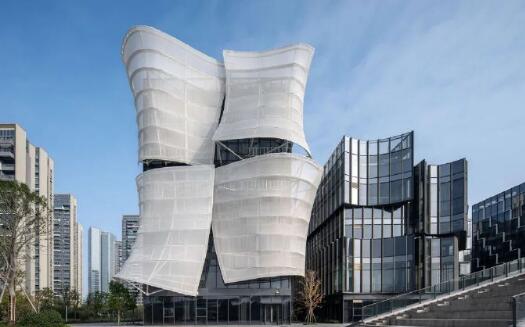那么應(yīng)用織物結(jié)構(gòu)的案例,室內(nèi)外的視覺(jué)效果又是怎樣的呢?首先,織物結(jié)構(gòu)非常適合做立體造型,其次,視覺(jué)通透,遮擋眩光。