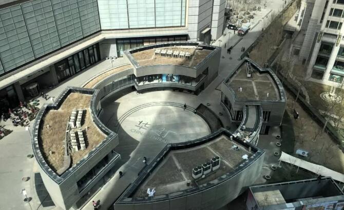 北京華貿(mào)中心是由寫字樓、商城、酒店公寓等組成的大規(guī)模商務(wù)建筑群,其間為華貿(mào)廣場,后由于使用功能要求在廣場上加建頂蓋,如圖1所示。由于周邊結(jié)構(gòu)已經(jīng)建成,故甲方希望加建的頂蓋,自重要輕、支座反力要小、施工要快、造型要新穎。因此經(jīng)過多方案比較,最終選定了索穹頂結(jié)構(gòu)形式。