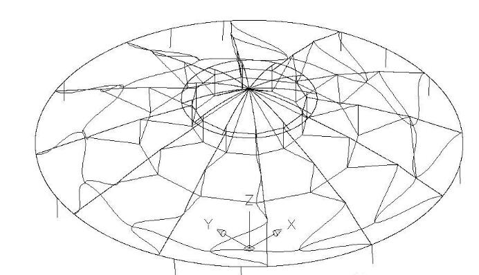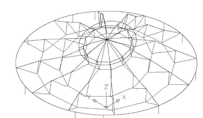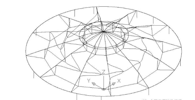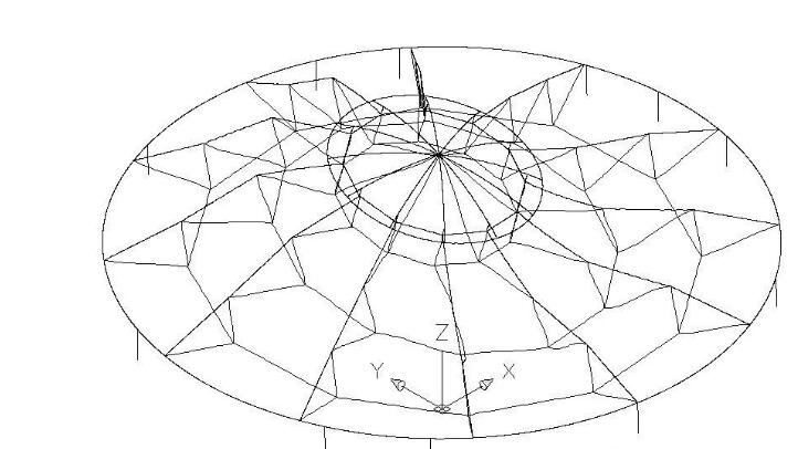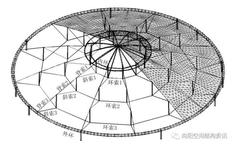 定義一下結(jié)構(gòu)各構(gòu)件的名稱,分別為內(nèi)環(huán)、外環(huán)、脊索1~3、環(huán)索1~3、斜索1~3、撐桿1~3,如圖2所示。邊界條件是確定的,即外環(huán)直徑33.4米、內(nèi)環(huán)直徑9米。而穹頂?shù)氖父摺⒚扛鞯念A(yù)拉力是未知的。初始形態(tài)設(shè)計(jì)就是要尋求滿足邊界條件、在合理的預(yù)拉力分布下,結(jié)構(gòu)的外形包括矢高。所謂合理的預(yù)拉力,就是預(yù)拉力不能太小也不能太大。太小,剛度不足,在荷載作用下結(jié)構(gòu)變形不能滿足規(guī)范要求;太大,桿件強(qiáng)度又不能滿足規(guī)范要求,無休止的加大截面又會(huì)造成用鋼量增加。因此,這是一個(gè)假定預(yù)拉力分布、找形、受荷計(jì)算、調(diào)整預(yù)拉力分布、再找形、再受荷計(jì)算,直至循環(huán)到合理的預(yù)拉力分布及其對(duì)應(yīng)的形狀的過程。