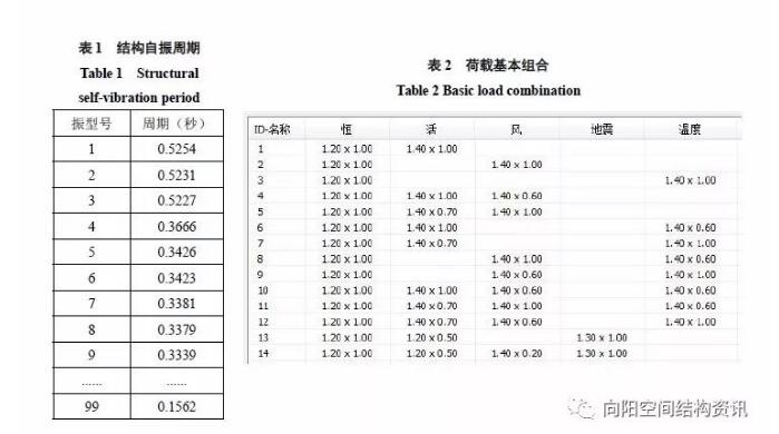 然后對(duì)結(jié)構(gòu)進(jìn)行各種荷載及作用組合下的計(jì)算分析,基本組合如表2所示。經(jīng)過對(duì)結(jié)構(gòu)的非線性分析,結(jié)構(gòu)中心點(diǎn)在恒荷載與活荷載標(biāo)準(zhǔn)值作用下?lián)隙葹?06mm,跨度為33.4m,106/33400=1/315,滿足規(guī)范中不大于1/250容許撓度值的要求[4]。