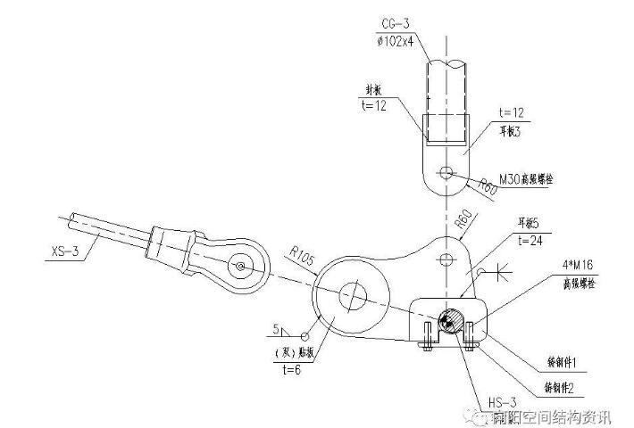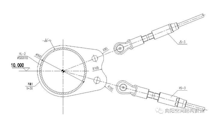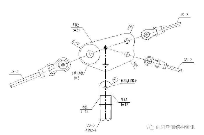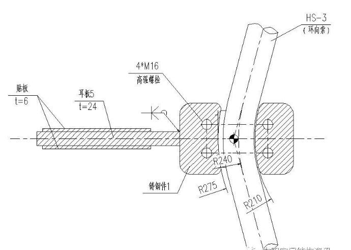 索穹頂?shù)墓?jié)點(diǎn)設(shè)計(jì),既要保證符合計(jì)算假定,又要便于施工張拉,因此正確合理的節(jié)點(diǎn)設(shè)計(jì)是關(guān)鍵的一步。以下例舉幾處索穹頂膜結(jié)構(gòu)的特有節(jié)點(diǎn)。如圖8所示,為脊索、斜索匯交與外環(huán)梁處的節(jié)點(diǎn)。圖9所示為撐桿下端與脊索的節(jié)點(diǎn)。圖10所示為撐桿上端與斜索及環(huán)索的節(jié)點(diǎn)。圖11為實(shí)際索節(jié)點(diǎn)照片。