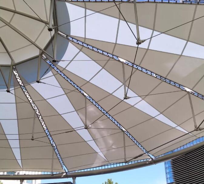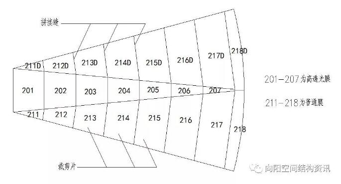 膜面與脊索的連接節(jié)點(diǎn)如圖12所示。另外我們知道,膜結(jié)構(gòu)還需要進(jìn)行裁剪設(shè)計(jì),即用平面的、有一定幅寬的膜材,通過裁剪,拼接出曲面的膜單元。一般來講,拼接縫的布置首要考慮的是膜材的利用率,盡量的減少裁剪損耗。本項(xiàng)目在兼顧利用率的同時(shí),更注重的是美觀。根據(jù)索的布置特點(diǎn),如圖13所示將拼接縫設(shè)計(jì)為輻射狀的環(huán)形,實(shí)際效果圖14所示。