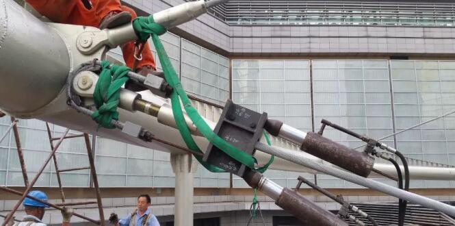五、張拉斜索3,這是最重要一步。當(dāng)然,如果12根斜索3同時(shí)張拉是最理想的,但由于設(shè)備限制,采用分組分批張拉的辦法,即對(duì)稱的4根斜索同時(shí)張拉,達(dá)到設(shè)計(jì)預(yù)定值的70%;然后進(jìn)行下一組的4根斜索的張拉,至設(shè)計(jì)預(yù)定值的80%;接著進(jìn)行最后一組4根斜索的張拉至預(yù)定值的90%。然后進(jìn)行第二次循環(huán),直至100%達(dá)到每根斜索3的設(shè)計(jì)預(yù)拉力值。