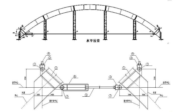 大跨度實(shí)腹式弧形鋼梁液壓提升主要原理是:提升結(jié)構(gòu)在安裝位置下方進(jìn)行整體拼裝,設(shè)置水平張拉裝置和豎向提升裝置,提升時(shí)水平張拉裝置隨豎向提升裝置加載而加載,當(dāng)豎向提升裝置加載到提升單元離地時(shí)水平張拉裝置停止加載,提升單元在恒力狀態(tài)下進(jìn)行提升。為保證提升單元順利就位,當(dāng)溫度升高時(shí)水平張拉裝置加載,當(dāng)溫度降低時(shí)水平張拉裝置卸載;當(dāng)鋼柱間距偏大時(shí)水平張拉裝置加載,當(dāng)鋼柱間距偏小時(shí)水平張拉裝置卸載。每個(gè)弧形梁下方的水平張拉裝置都能獨(dú)立操作。