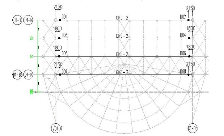 (1)采用液壓同步提升大跨度穹頂結(jié)構(gòu),需要合理設(shè)置提升吊點(diǎn),確保原結(jié)構(gòu)的變形及應(yīng)力水平在規(guī)范允許的范圍內(nèi),盡量減小提升過程中實(shí)際狀態(tài)與設(shè)計(jì)狀態(tài)的差異,因此在每榀拱形屋架的拱腳均設(shè)置一個(gè)提升點(diǎn)。提升下吊點(diǎn)平面布置見圖2。