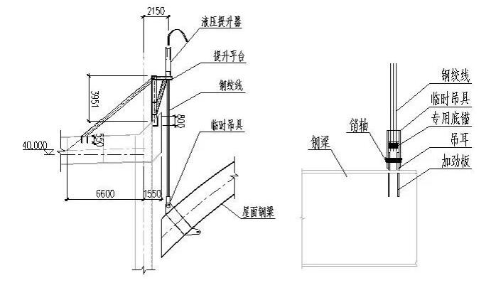 考慮施工方便并且傳力明確,下吊點(diǎn)及水平拉索節(jié)點(diǎn)采用雙L形耳板統(tǒng)一設(shè)置,L形耳板上部連接提升下節(jié)點(diǎn)吊具,L形耳板水平端連接水平張拉索的吊籠(提升器)及吊具(地錨,見圖5)。
